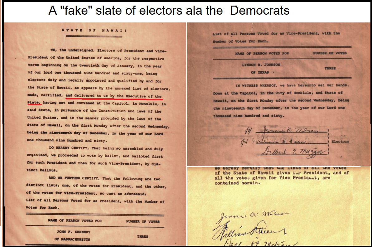 However, there is one slate of electors that truly was deceptive. It is the one used by Democrats during the Kennedy/Nixon election. Unlike the 2024 slate of certificates, the Kennedy/Nixon slate falsely claimed that it came from the “executive of the state,” who was, effectively, Hawaii’s governor. (See red underline in Fig. 2.)
