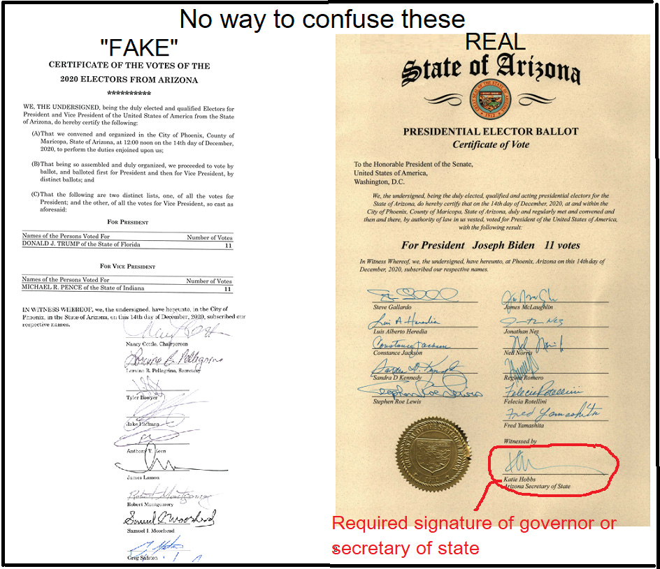 Trickery was not involved, and the slates were not “fake.” None of them had been signed by a state executive, and none had a state seal. Although the alternative electors signed their names on these draft documents, the essential signature of the governor (or Secretary of State) was absent in each case. In other words, they were only unused draft documents.